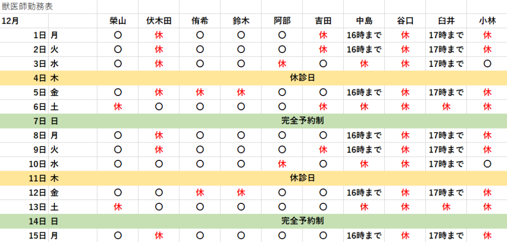獣医師勤務表 2025年12月