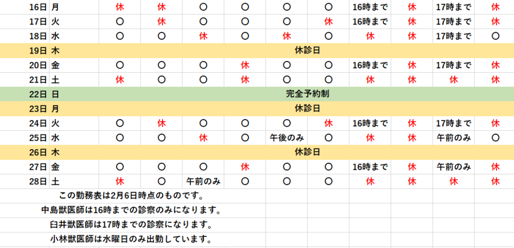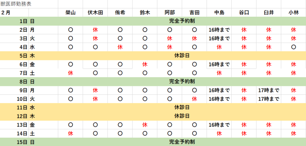 獣医師勤務表 2026年2月
