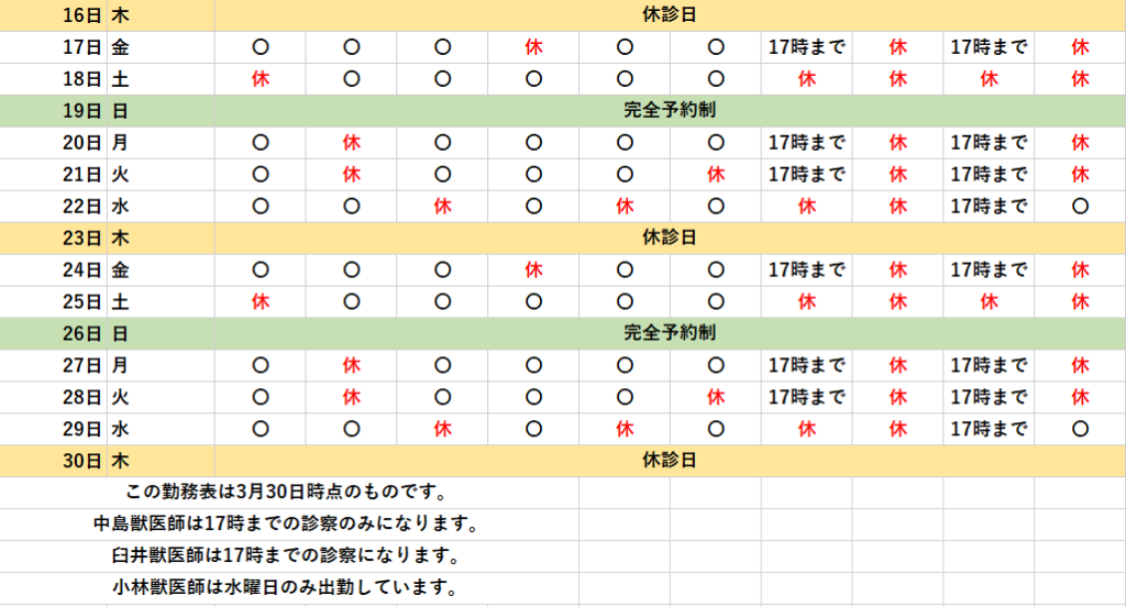 獣医師勤務表 2026年4月